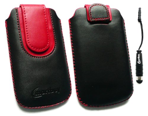 Emartbuy ® Pack Stylet Pour Nokia C2-02 Noir / Rouge Premium En Cuir Pu Faites Glisser Pouch / Case / Sleeve / Support (Taille Moyenne) Avec Un Mécanisme De Tirette + Mini Metallic Noir Stylus + Protecteur D'Écran Lcd