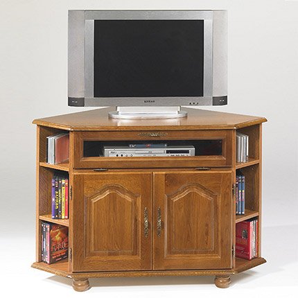 Meuble TV d'angle chêne 2 portes 1 abattant vitré Largeur 114 cm Hauteur 77 cm Profondeur 77 cm (maxi). Ce meuble TV d'angle chêne est conçu pour recevoir votre matériel TV et HI-FI. - 1 tablette fixe (lecteur DVD, magnétoscope) - 1 tablette réglable derrière les 2 portes - 2 petites étagères de chaque côté. - 2 Portes en chêne massif. - 1 abattant vitré (cadre chêne massif / verre épaisseur 3 mm) Structure en panneaux de particules de bois plaquée ch